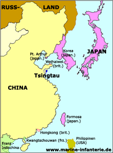 Nachdem Deutschland sich im Jahr 1897 an der chinesischen Küste durch den Erwerb Tsingtaus festsetzte, wurde es Teil des prestigeträchtigen ostasiatischen Machtspiels der europäischen Großmächte und Japans. So spielte Deutschland beispielsweise eine treibende Kraft bei der Niederschlagung des Boxeraufstandes im Jahre 1900/01 und erschloß vordringlich die nordostchinesische Provinz Schantung. Durch das hochmütige Ausschlagen eines japanischen Bündnisangebots seitens Deutschlands, wandte sich Japan in gleicher Angelegenheit an Großbritannien. Dieses nutzte die Gunst und einigte sich mit Japan im Jahr 1902 auf ein gemeinsames Bündnis. Diesem Abkommen gemäß stellte Japan nach Ausbruch des I. Weltkriegs am 15. August 1914 Deutschland ein Ultimatum mit der Forderung, das Schutzgebiet nebst allen Rechten den Japanern zu übergeben und seine Streitkräfte aus Ostasien abzuziehen. |